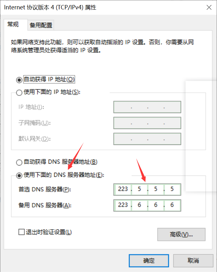 先选择使用下面的DNS服务器地址 然后输入 223.5.5.5.5